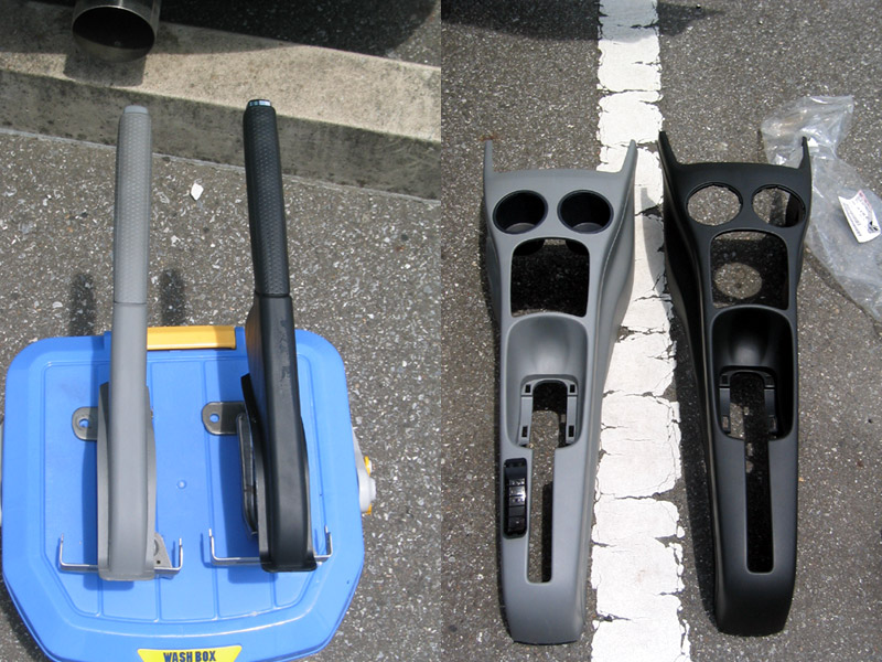大きい部品は写真の2つ。あとはカバーとファスナーでした。発注のときディーラーの人がファスナーの注文を忘れていたのを帰宅後に気が付き、タッチペンで塗ればいいかと考えていたのですが、気が付いた担当さんがちゃんと追加しといてくれました。全部で12000円弱。コンソールは安かったのですが、サイドブレーキはAssyでしか入手できず割高になってしまいました(^^;;;でもサイドブレーキのノブのロックボタンは硬質でメッキチックになったのでかなりお気に入りです。