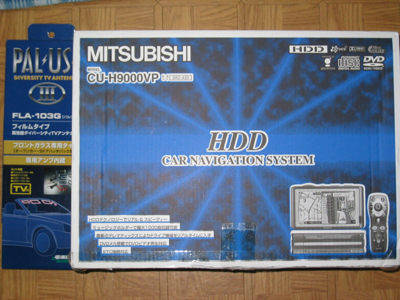 高値で買い取られていったとはいえ、次機に注ぎ込めるお金がそんなにある訳もなく、前と同じようなDVDナビしかかえないかな〜と思っていたところ、実家の近所の用品店で15万ぽっきりでHDDナビを発見!数量限定でしたが、交渉でフィルムアンテナを付けてもらえることになったので即買いの衝動にかられましたが、その場は嫁に止められ一旦帰宅しました。価格コムで調べているとなんと12万円代であるじゃないですか!嫁大正解。どうせ取り付けは自分でやるから通販でも問題ないし、これなら何とか2人の小遣いから捻出できる!と早速注文。フィルムアンテナは別途購入。それでも十分10万円台前半で収まりました。