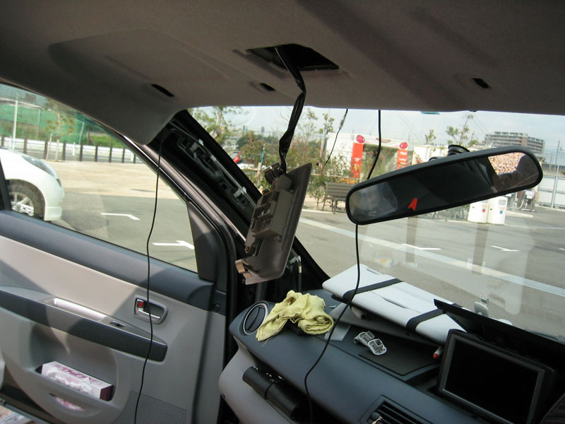 ナビの動作が確認できたところでフィルムアンテナの取り付けに突入。有休をとって一日中カレスト幕張で作業しました。フィルムタイプは初めてだったので前日に説明書を熟読。ブースターを付けなきゃいけないので、ロッド式よりも面倒くさそう・・・。さらにフロントウインドウ上部にアースさせないといけないそうですが、そんな都合の良いところにネジがあるか不安が。。配線の延長も不可と書いてあるし。