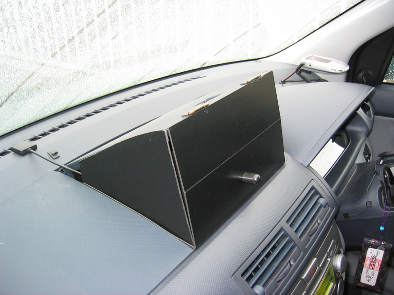 モニタのところをちょっと格好よく見せるために、発泡塩ビ板でサイドパネルと蓋を作りました。(が、春先に日光の熱で蓋が変形してしまったので今はサイドだけです。)