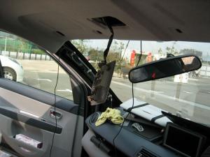 とにかく買ってしまったものはしょうがないので作業開始。いきなりバキバキとAピラーや天井をはがそうとするが、バイザーやルームランプが邪魔して上手く外れない・・・結局そこいら中の部品をひっぺがしてどうにか天井の鉄板が見えました。納車4ヶ月で見るも無残な姿に(^^;;;